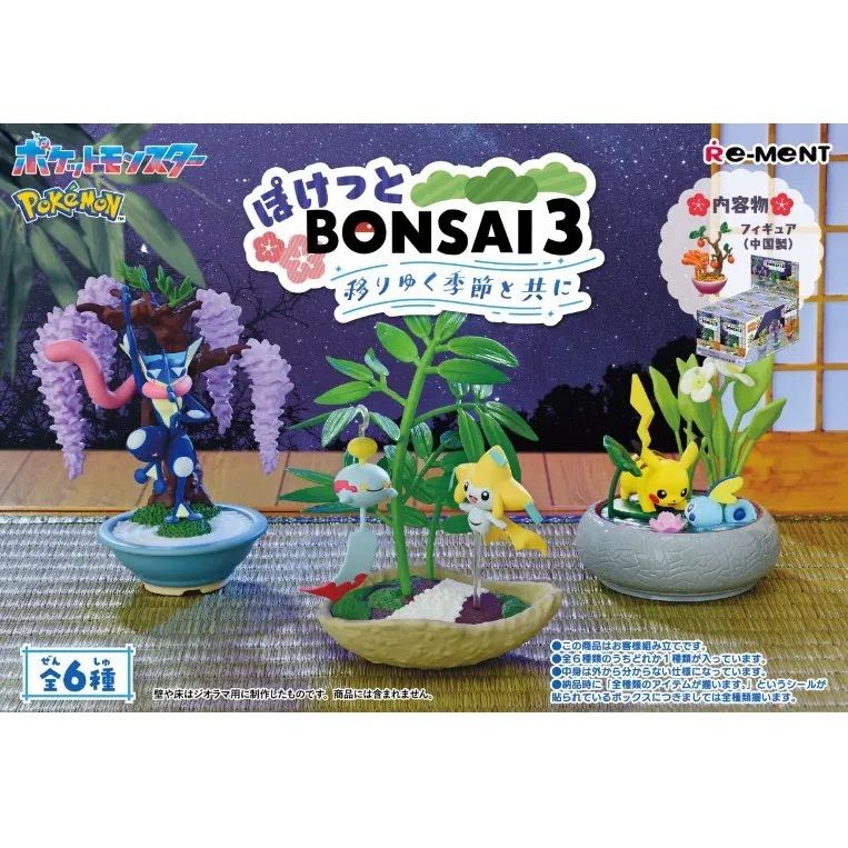 Disfruta de una escena serena y elegante con Pokémon Pocket BONSAI 3 – With The Changing Seasons, una colección que fusiona los mundos de Pokémon y el arte del bonsái japonés. Esta caja completa contiene 6 figuras en miniatura (tipo blind box), cada una ambientada en un estilo estacional único: primavera, verano, otoño e invierno, representando Pokémon como Pikachu & Sobble, Greninja, Vulpix, Torterra, Jirachi & Chimecho, y Articuno.